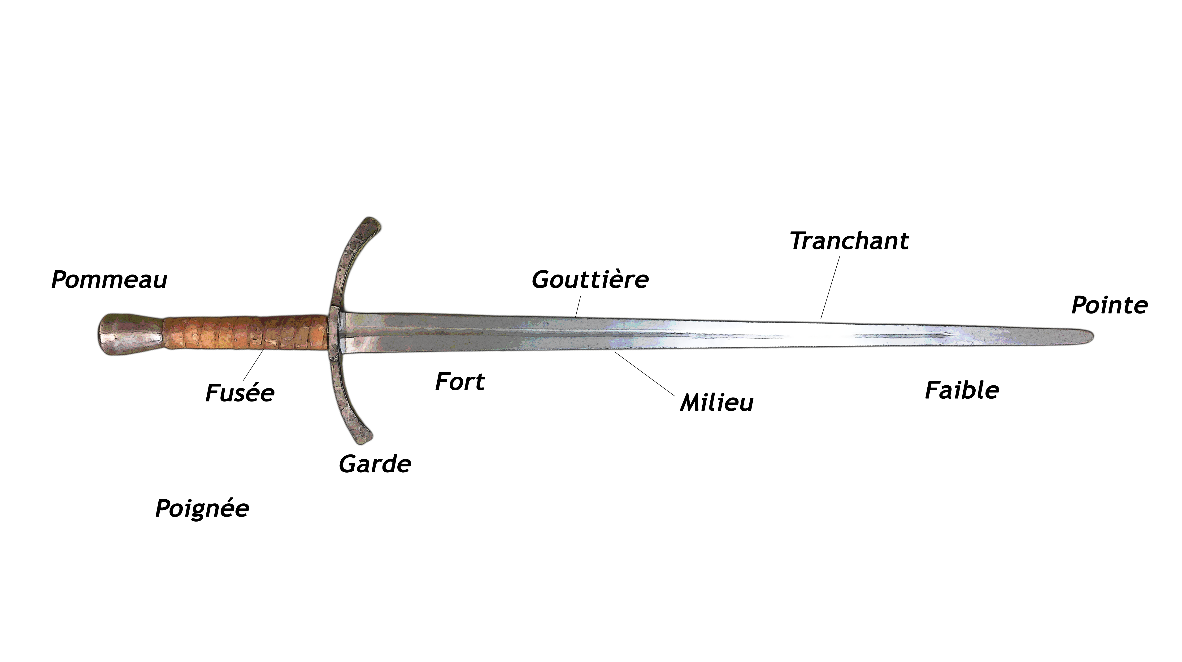 Une épée se compose généralement de quatre parties : la lame, le quillon ou la garde, la poignée ou fusée et le pommeau. La lame possède deux tranchants plus ou moins parallèles. On parle de tranchant long (vrai tranchant), qui est tourné vers l'avant au-dessus des doigts de la main, et de tranchant court (faux tranchant), qui nous fait face. La lame est ensuite divisée en plusieurs parties. Pour simplifier, nous parlerons uniquement du faible (de la