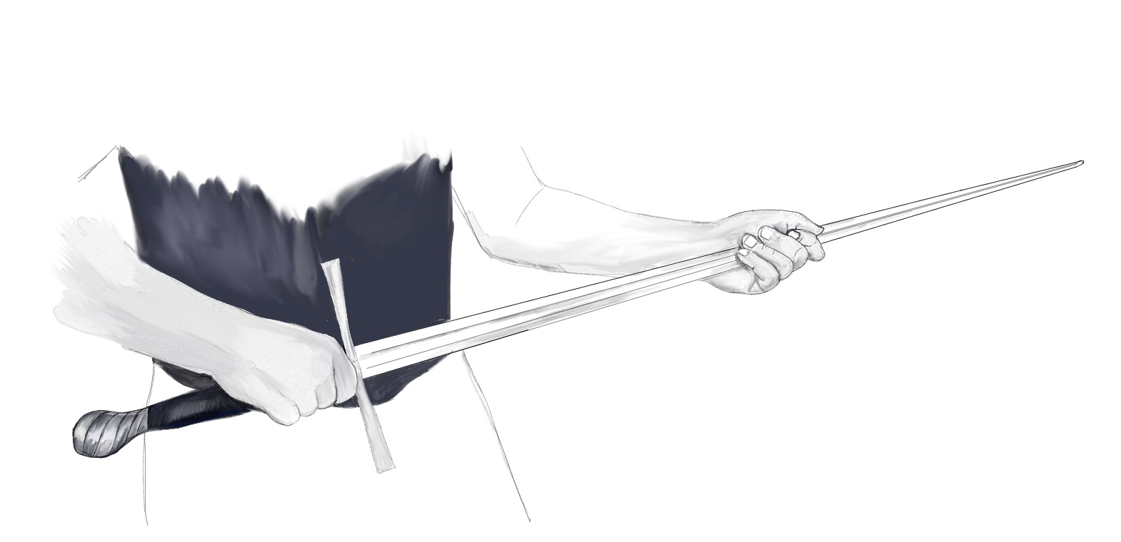 La prise de combat La main principale se trouve toujours à proximité de la garde, la poignée est saisie par le quatrième et le cinquième doigt de la main. La garde se trouve entre l'index et le pouce. Grâce à cette position de la main, la mobilité du poignet est plus grande, mais il est également plus difficile de stopper le coup.