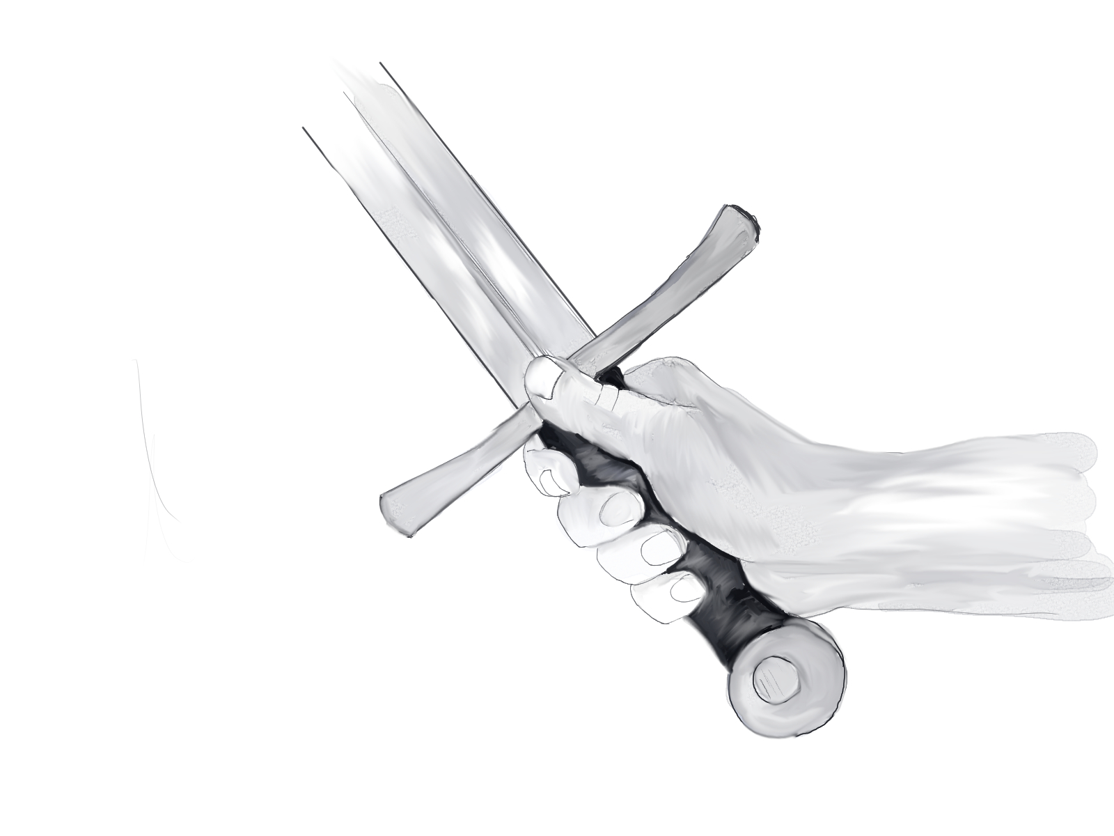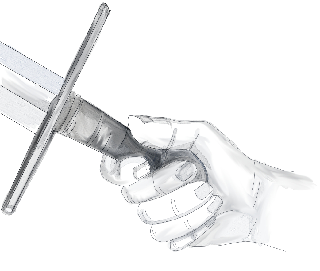 La prise du marteau L'arme est tenue avec la main principale aussi près que possible de la garde, le pouce et l'index formant un anneau autour de la crosse. Les autres doigts entourent fermement la poignée. Le fait de bloquer le poignet donne plus de stabilité lorsque l'épée est lourde. La lame et le bras forment un angle d'environ 130°. Le coude et l'épaule sont davantage impliqués dans le mouvement du bras. L'avantage est un meilleur contrôle du coup et un arrêt plus facile de la frappe. |